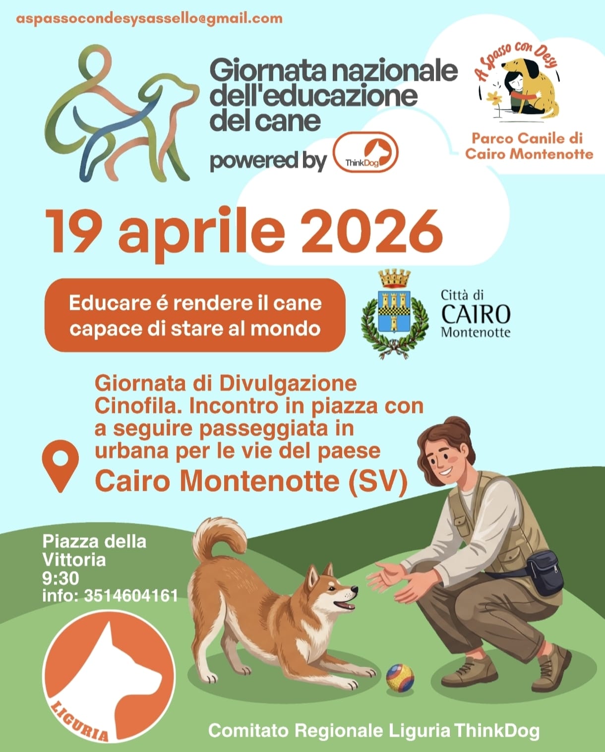 L’associazione “A spasso con Desy - Parco Canile di Cairo Montenotte”, con il patrocinio del Comune, domenica 19 aprile, organizza un incontro formativo e di condivisione.