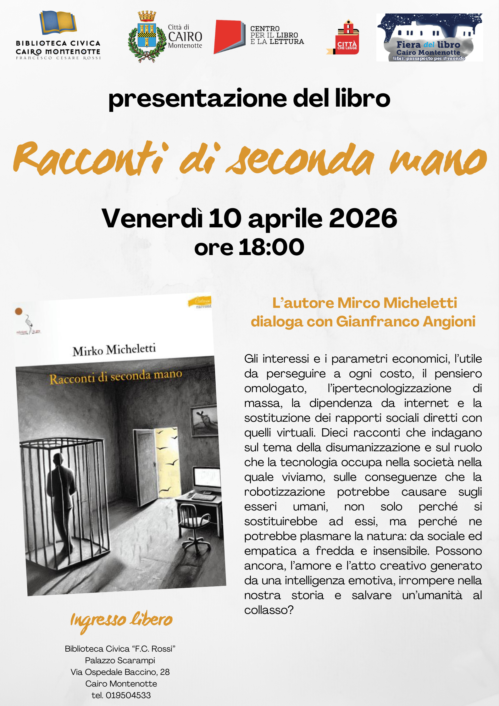 Presentazione del libro "Racconti di seconda mano", l’autore Mirco Micheletti dialoga con Gianfranco Angioni presso la Blioteca Civica "F.C. Rossi" venerdì 10 aprile alle ore 18:00
