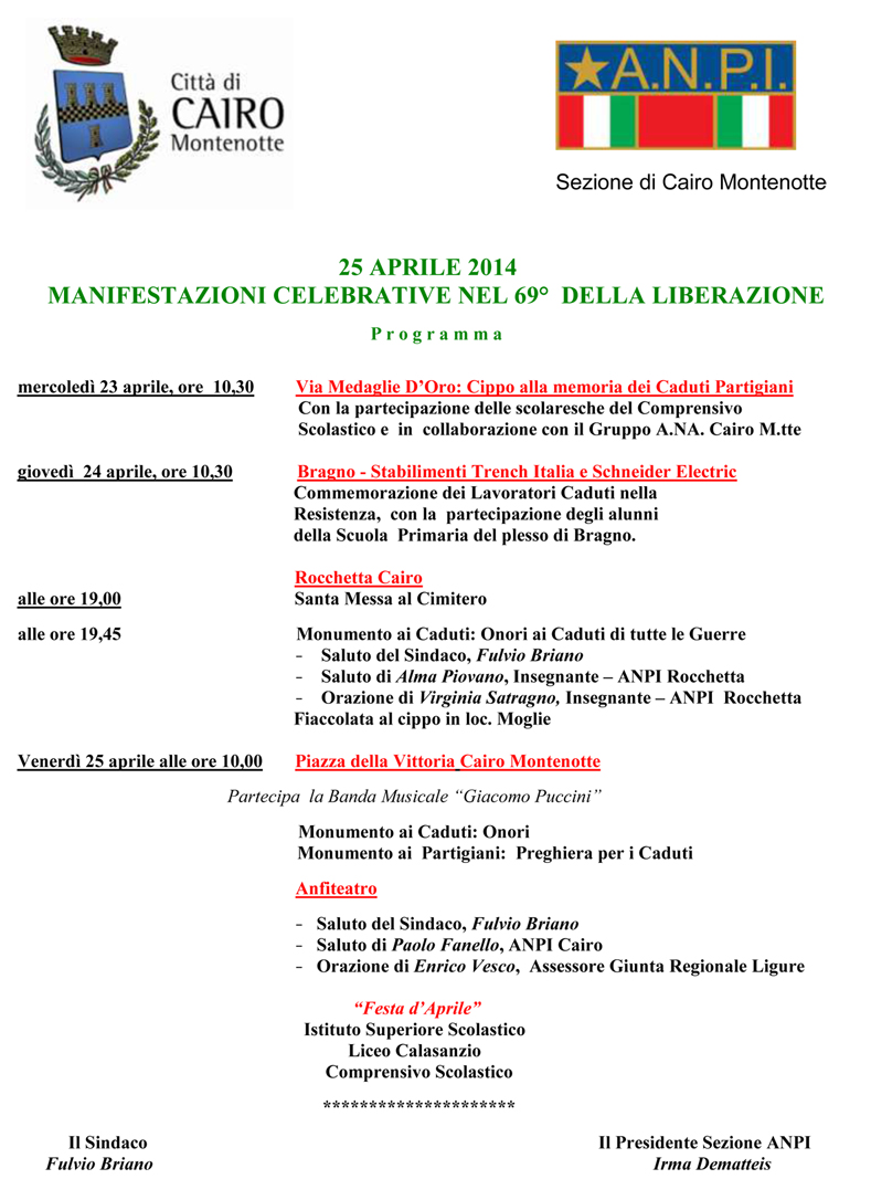Scarica il programma delle manifestazioni celebrative per il sesantanovesimo anniversario della Liberazione d'Italia, simbolo della fine del ventennio fascista, della seconda guerra mondiale nel paese e dell'occupazione da parte della Germania nazista: