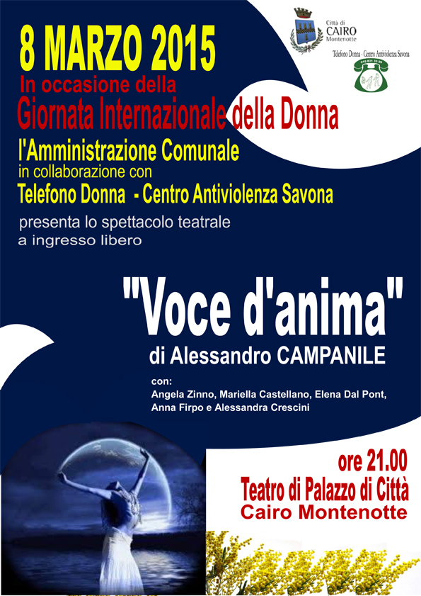 In occasione della Giornata Internazionale della Donna l'Amministrazione Comunale in collaborazione con Telefono Donna - Centro Antiviolenza di Savona presenta lo spettacolo "Voce d'anima" di Alessandro Campanile con Angela Zinno, Mariella Castellano, Elena Dal Pont, Anna Firpo e Alessandra Crescini.