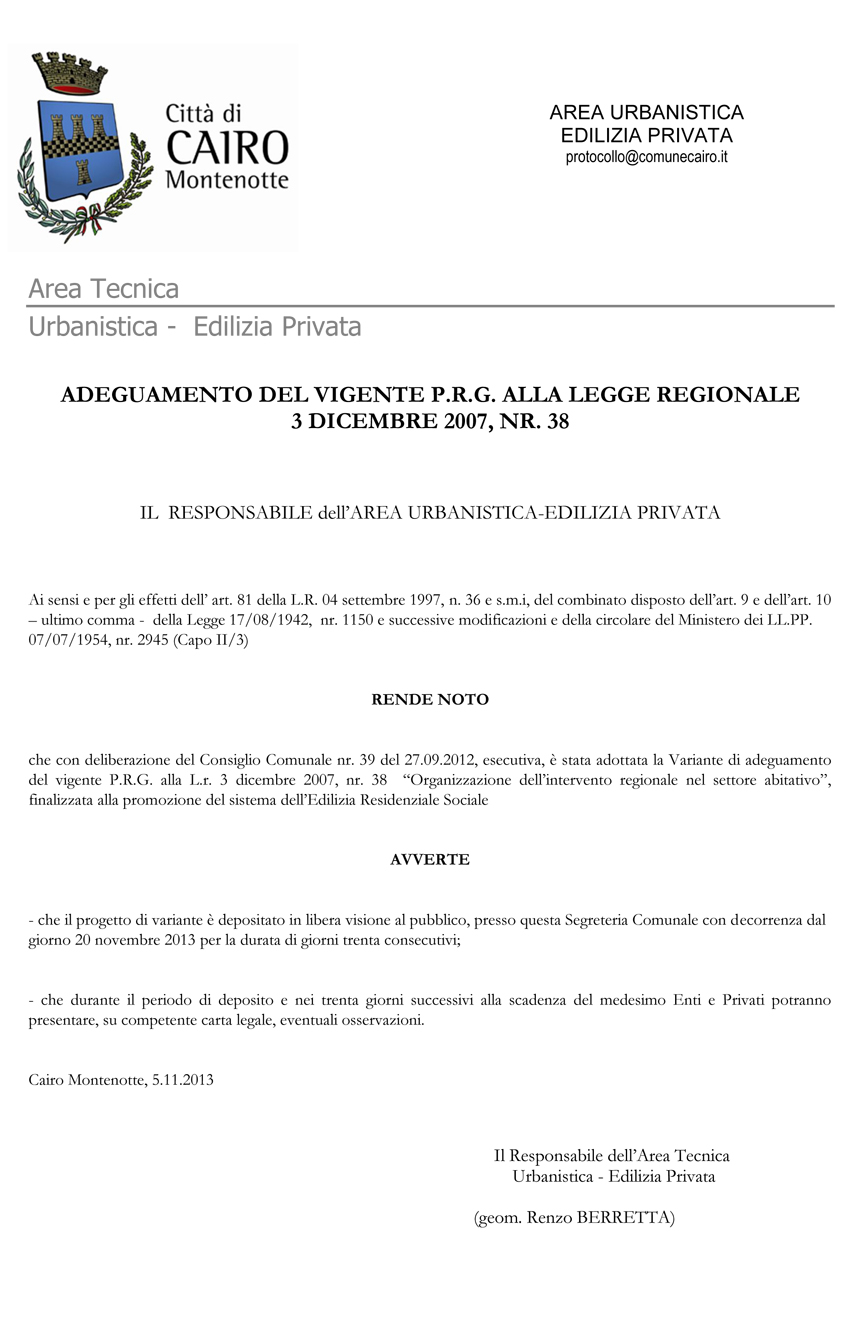Con la deliberazione del Consiglio Comunale nr. 39/2012 era stata adottata la Variante di adeguamento del vigente Piano Regolatore Generale alla Legge Regionale del 3 dicembre 2007, nr. 38 “Organizzazione dell’intervento regionale nel settore abitativo”, finalizzata alla promozione del sistema dell’Edilizia Residenziale Sociale. Con decorrenza dal giorno 20 novembre 2013 il progetto di variante è depositato in libera visione al pubblico presso la Segreteria Comunale per la durata di giorni trenta consecutivi. Durante il periodo di deposito e nei trenta giorni successivi alla scadenza del medesimo Enti e Privati potranno presentare, su competente carta legale, eventuali osservazioni.