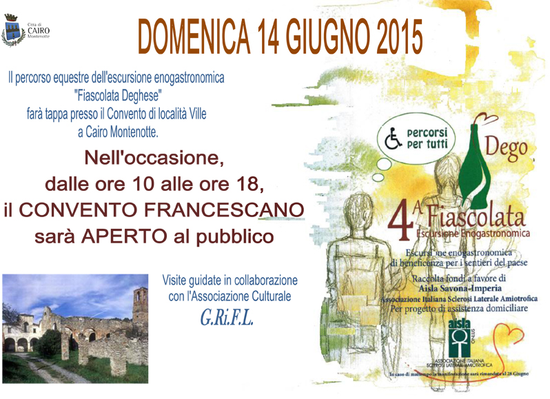 Domenica 14 giugno 2015, in occasione della quarta edizione della Fiascolata Deghese, l'escursione enogastronomica dedicata alla raccolta fondi per l'AISLA, il Convento Francescano sarà una tappa del percorso a cavallo e contemporaneamente verrà aperto a tutti per le visite dalle 10 alle 18 con un servizio di guida turistica.