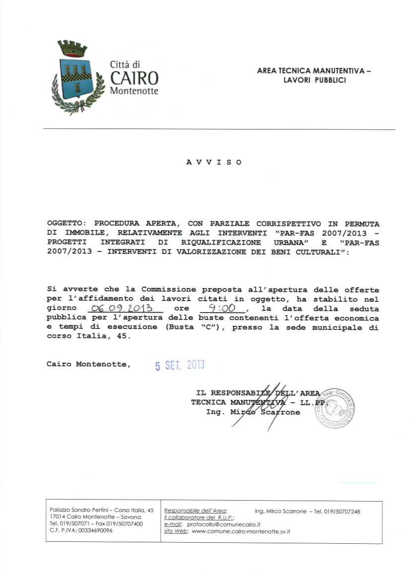 Si avverte che la Commissione preposta all'apertura delle offerte relative al Bando di gara a procedura aperta, con parziale corrispettivo in permuta di immobile, relativamente agli interventi PAR-FAS 2007/2013 - "Progetti integrati di riqualificazione urbana” e PAR-FAS 2007/2013 – "Interventi di valorizzazione dei beni culturali”, ha stabilito nel giorno venerdì 6 settembre 2013 alle ore 9.00 la data della seduta pubblica per l'apertura delle buste contenenti l'offerta economica e i tempi di esecuzione (Busta "C"), presso la sede municipale di corso Italia 45.