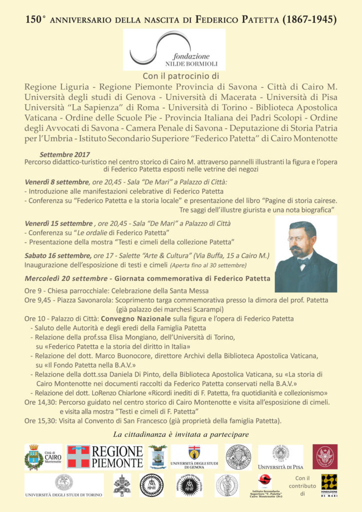 Nella ricorrenza del 150° anniversario della nascita di Federico Patetta, nato a Cairo Montenotte nel 1867 (deceduto ad Alessandria nel 1945), la Fondazione Bormioli si è fatta promotrice di un programma di iniziative, condivise con l’Amministrazione Comunale, finalizzate a valorizzare la figura e l’opera dello studioso cairese, per farlo conoscere e meglio apprezzare in primis dai suoi stessi concittadini. Fino ad ora, le iniziative volte ad onorare la figura dell’illustre cairese, giurista e insigne storico del diritto, sono state la dedica di una lapide commemorativa, posta sulla casa natale, inaugurata il 26 settembre 1952 alla presenza dell’allora Presidente della Repubblica, on. Luigi Einaudi e l’intitolazione (poi caduta in disuso) della locale scuola per ragionieri.