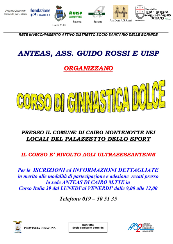 ISCRIZIONI e INFORMAZIONI presso la sede ANTEAS DI CAIRO M.TTE in Corso Italia 39 dal LUNEDI’al VENERDI’ dalle 9,00 alle 12,00, telefono 019 505135.