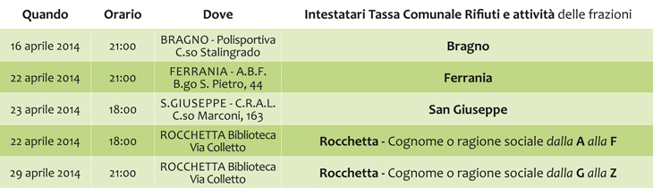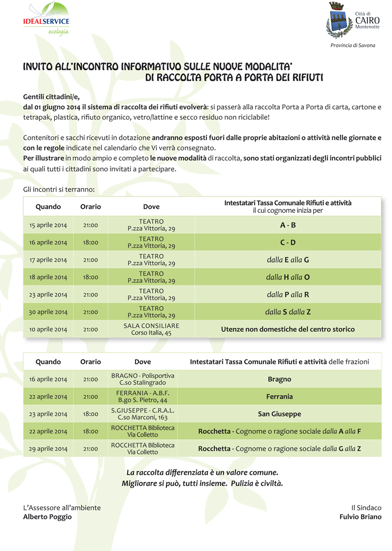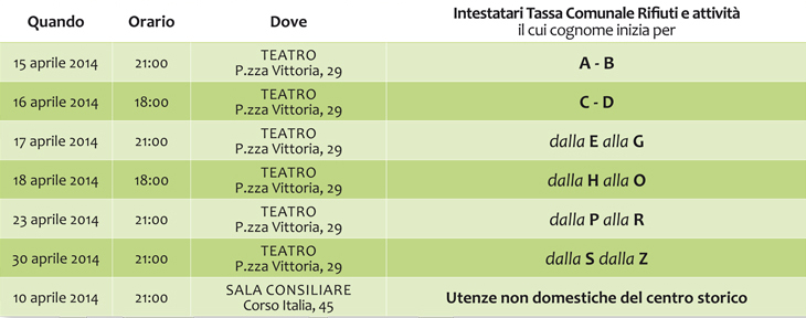 Dal prossimo mese di giugno inizierà il nuovo servizio di raccolta dei rifiuti con il porta a porta di carta, cartone e tetrapak, plastica, rifiuto organico, vetro/lattine e secco/residuo non riciclabile. Per questa ragione l'Amministrazione e la società che gestisce la raccolta hanno organizzato una serie di incontri pubblici per i cittadini e le imprese che si svolgeranno lungo il mese di aprile per illustrare meglio possibile le nuove modalità di raccolta. Per dare spazio a tutti di partecipare, gli incontri sono stati suddivisi lungo un calendario di appuntamenti che vanno dal 15 al 29 aprile e si svolgeranno in parte all'interno del teatro di Palazzo di Città, in Piazza della Vittoria, ed in parte nelle frazioni, (più un appuntamento speciale dedicato alle utenze non domestiche del centro storico che si terrà nella Sala Consiliare il 10 aprile). Gli appuntamenti sono stati suddivisi in base alla iniziale del cognome dell'intestatario della Tassa sui Rifiuti per far sì che agli incontri non ci siano più persone di quelle che possono contenere le sale.