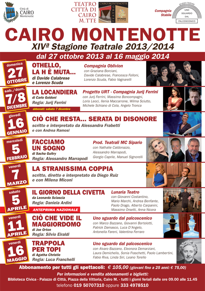Per questo spettacolo sono ancora disponibili circa trenta biglietti: prenotazioni presso il Palazzo di Città di Cairo Montenotte (tutti i giorni feriali dalle 9.00 alle 11.45 e sabato anche dalle 15 alle 17.45, oppure telefonando al n. 333 4978510).