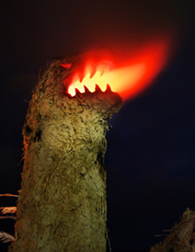 Da non perdere saranno le serate del Drago: verrà installato nella pizza principale un grande “Forno-Drago”, Claudio Carrieri, con fuoco a legna cuocerà, in modo spettacolare, fino a oltre 1000°C, ceramiche e maioliche. In realtà questo forno è anche una scultura in ceramica di notevoli dimensioni che deve la sua forma di drago alla tecnica di cottura, appunto simile a quella degli antichi forni-drago orientali. La prima esperienza Draku (denominazione ironica per evitare confusioni con la ormai diffusissima tecnica Raku) di Carrieri risale al 1992, quando modellò il drago sputa fuoco sulla fortezza del Priamar a Savona. Proprio dall’idea di rivisitare quell’esperienza nasce il progetto in questione, proposto ad Andrea Vitali, regista di Cairo Medioevale, che lo ha abbracciato con entusiasmo, inserendolo nella Manifestazione 2014. Il progetto si è poi sviluppato nel modo che abbiamo descritto, perfezionando gli aspetti che vanno nella direzione che più interessa all’artista (il quale ha potuto avvantaggiarsi del fatto di essere anche insegnante dell’ISS di Cairo M) ovvero la partecipazione e la funzione civile dell’arte. Infine, ancora di Carrieri, una grande scultura luminosa, realizzata in acciaio nelle Officine OCMI di Cairo e decorata con vetri artistici (due materiali-simbolo che hanno segnato la storia della Val Bormida). La forma manifestamente augurale è quella dell’ uroboro (che si mangia la coda, il male che si annulla), delicatamente ironico il titolo: “Luciferro”. Quest’ultima opera, collocata in uno spazio pubblico, resterà alla Città.