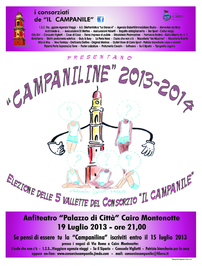 Nell'anfiteatro del Palazzo di Città il 19 luglio si terrà l'elezione delle cinque "campaniline", per iscriversi al concorso c'è tempo fino al 15 luglio. Le vincitrici saranno chiamate durante le manifestazioni direttamente organizzate dal Consorzio e anche in quelle dove collabora il Consorzio per rappresentare il Consorzio stesso e svolgere funzioni di info point per la cittadinanza.