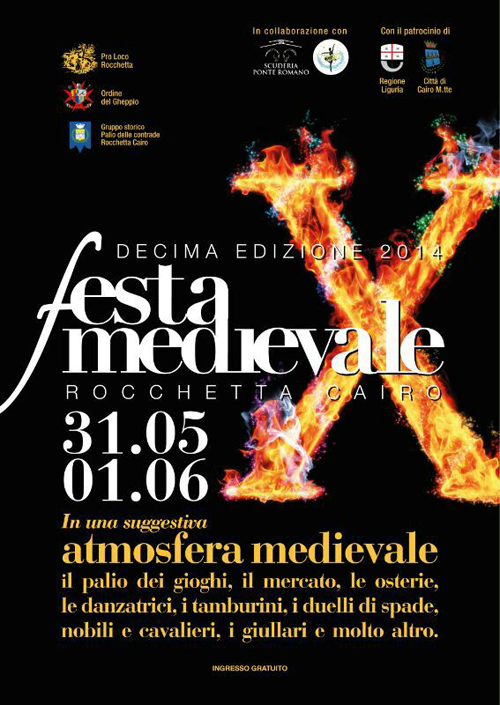 Dopo il successo delle scorse edizioni sabato 31 maggio e domenica 1 giugno torna a Rocchetta di Cairo la decima edizione della Festa Medievale: a partire dalle ore 18 di sabato 31 ci si potrà calare in un mondo passato, girando per le vie del borgo ci si potrà rifocillare nelle taverne e nei vari punti di ristoro, si potrà ammirare gli accampamenti oppure soffermarsi ad osservare artigiani intenti a riproporre i mestieri antichi.