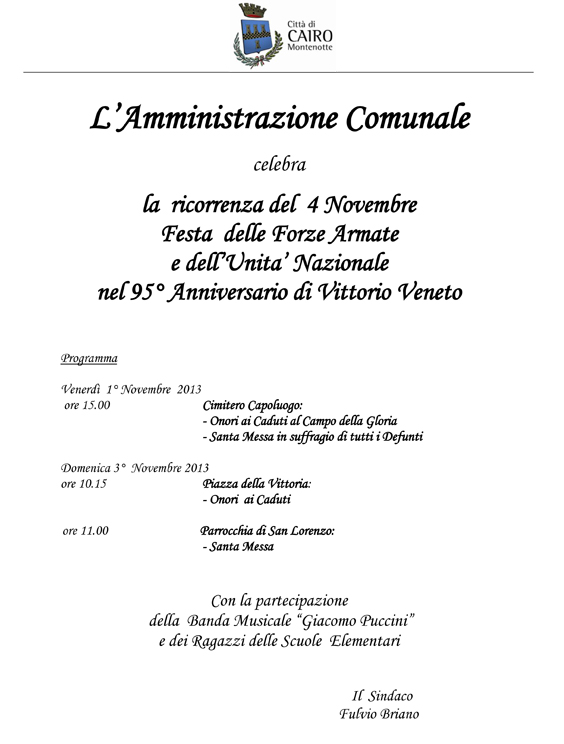 L’Amministrazione Comunale celebra la ricorrenza del 4 Novembre Festa delle Forze Armate e dell’Unita’ Nazionale nel 95° Anniversario di Vittorio Veneto, con la partecipazione della Banda Musicale “Giacomo Puccini” e dei Ragazzi delle Scuole Elementari. In programma: venerdì 1 novembre alle ore 15 Onori ai Caduti al Campo della Gloria presso il Cimitero Capoluogo e Santa Messa in suffragio di tutti i Defunti, domenica 3 novembre alle ore 10.15 in Piazza della Vittoria Onori ai Caduti e alle 11.00 la Santa Messa in San Lorenzo.