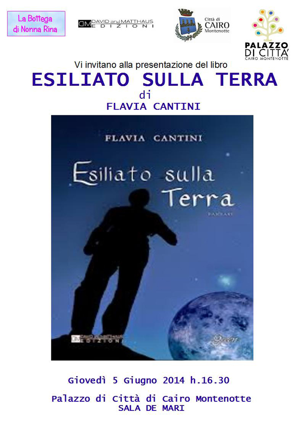 L'Associazione Culturale “ La Bottega di Nonna Rina” in collaborazione con il Comune di Cairo Montenotte e la casa editrice David and Matthaus Edizioni organizzano la presentazione del libro “ESILIATO SULLA TERRA” di Flavia Cantini (Autrice cairese al suo quarto romanzo) presso la sala A. De Mari del Palazzo di Città giovedì 5 giugno alle ore 16.30. Interverranno all'evento: