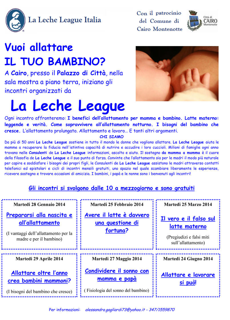 Martedì 28 gennaio inizia il nuovo ciclo di incontri dedicati all'allattamento materno organizzati dalla Leche League con il patrocinio dell'Amministrazione, rivolti alle mamme coi loro bambini, ai papà, alle nonne e ai fratellini più grandi, agli operatori del mondo della salute. Durante gli incontri le consulenti volontarie forniranno spiegazioni, sostegno ed incoraggiamento alle mamme che vogliono allattare il proprio bambino, nonché informazioni utili per affrontare al meglio l'allattamento e i primi mesi di maternità, aiutando le mamme a recuperare la fiducia nell'istintiva capacità di nutrire e accudire i propri figli. La partecipazione agli incontri, che si svolgono con cadenza mensile presso il Palazzo di Città, è del tutto gratuita.