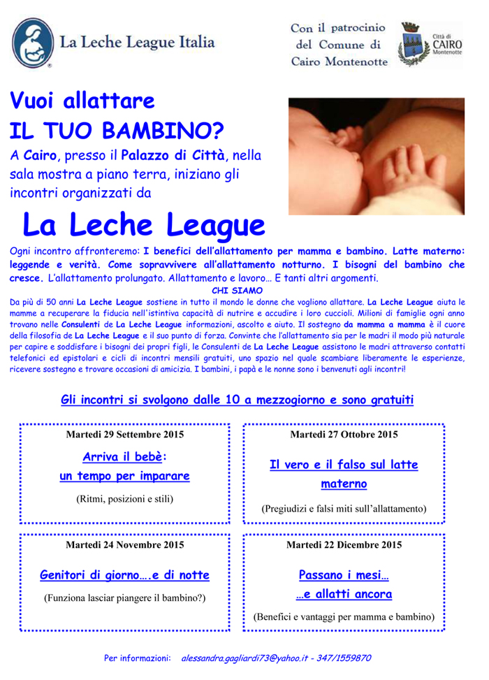 Al via il nuovo ciclo di incontri dedicati all'allattamento materno organizzati dalla Leche League con il patrocinio dell'Amministrazione, rivolti alle mamme coi loro bambini, ai papà, alle nonne e ai fratellini più grandi, agli operatori del mondo della salute. Durante gli incontri le consulenti volontarie forniranno spiegazioni, sostegno ed incoraggiamento alle mamme che vogliono allattare il proprio bambino, nonché informazioni utili per affrontare al meglio l'allattamento e i primi mesi di maternità, aiutando le mamme a recuperare la fiducia nell'istintiva capacità di nutrire e accudire i propri figli. La partecipazione è agli incontri, che si svolgono con cadenza mensile presso il Palazzo di Città, è del tutto gratuita.