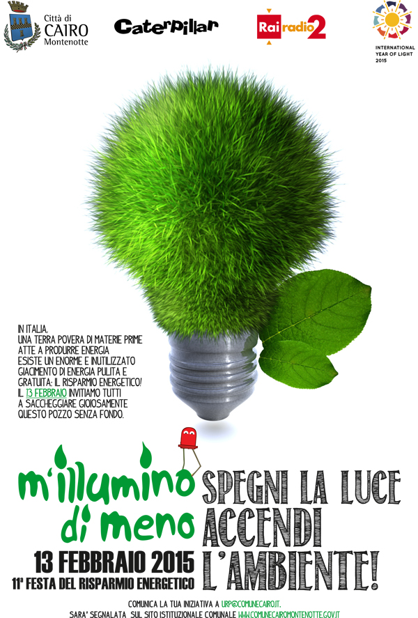 Venerdì 13 febbraio in Italia – e non solo – sarà celebrata la Giornata del Risparmio Energetico, nell'ambito della campagna radiofonica "M'illumino di Meno" promossa da "Caterpillar" (Radio 2). L'idea alla base di "M'illumino di Meno" è quella di concentrare in un'intera giornata il maggior numero di azioni virtuose di razionalizzazione dei consumi, sperimentando e promuovendo le buone pratiche di riduzione degli sprechi, produzione di energia pulita, mobilità sostenibile e riduzione dei rifiuti. Anche quest'anno il Comune di Cairo aderisce a "M'illumino di Meno"! Come segno di adesione, ma soprattutto di impegno volto al risparmio energetico, nel pomeriggio di venerdì 13 febbraio, dalle ore 18 alle 19.30, l'illuminazione pubblica dei monumenti cittadini sarà spenta, così come lo sarà – per tutta la serata e la notte! – anche quella di alcune frazioni, in modo che l'esempio virtuoso di Cairo sia visibile anche da lontano... Siamo tutti invitati, dalle istituzioni ai cittadini, dalle scuole ai negozi, dalle aziende alle associazioni a rendere visibile la nostra attenzione al tema della sostenibilità spegnendo giardini, vetrine, uffici ed edifici privati e tramite qualsiasi pratica volta ad un simbolico “silenzio energetico” tra le ore 18.00 e le ore 19.30 di venerdì 13 febbraio. Quello del 13 febbraio sarà un iniziale piccolo passo lungo un percorso che l'Amministrazione Comunale – con l'indispensabile adesione della cittadinanza – intende seguire in futuro in tema di tutela dell'ambiente e di razionalizzazione delle risorse e dei consumi.