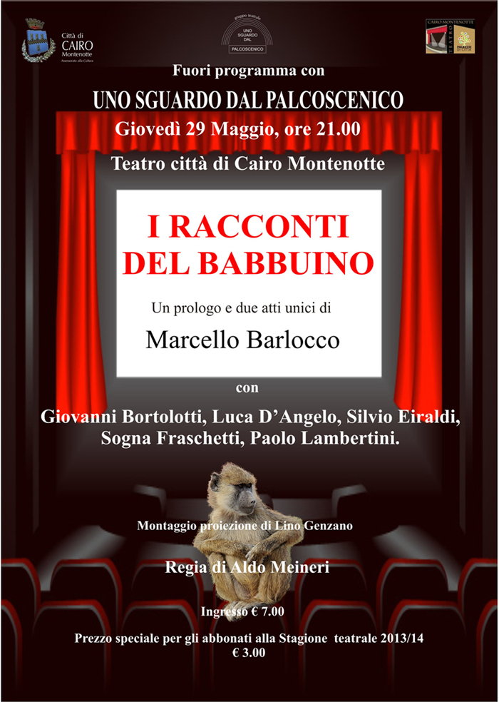 Giovedì 29 maggio alle ore 21.00 al Teatro Città di Cairo Montenotte un fuoriprogramma con la Compagnia Uno sguardo dal Palcoscenico che propone I racconti del babbuino, un prologo e due atti unici di Marcello Barlocco. La recitazione, sotto la regia di Aldo Meineri, è affidata a Giovanni Bortolotti, Luca D’Angelo, Silvio Eiraldi, Sonia Fraschetti e Paolo Lambertini. Il montaggio video è curato da Lino Genzano.