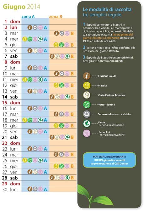 - [highlight bg="#FFFF00" color="#000000"]la zona di raccolta[/highlight]: infatti il territorio comunale è stato suddiviso in due zone, A e B, che hanno un calendario diverso di raccolta (nell'immagine sotto è riportato il calendario del mese di giugno dove si vedono le due colonne distinte per zona A e zona B, più in basso si vede la grafica con la rappresentazione delle due zone e il nome delle vie);