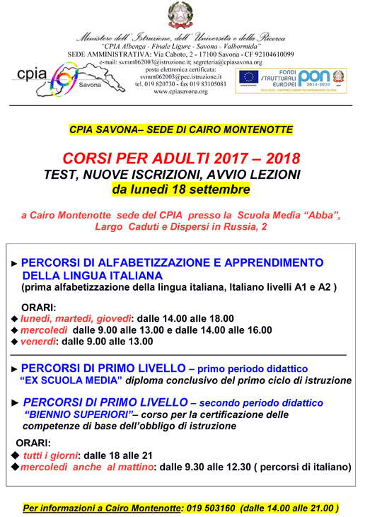 Da lunedì 18 settembre 2017 riprendono le lezioni del CPIA - Centro Provinciale Istruzione Adulti. I corsi disponibili, che si svolgono presso la sede di Cairo Montenotte del CPIA, in Largo Caduti e Dispersi in Russia, 2 (Scuola media "Abba"), sono: