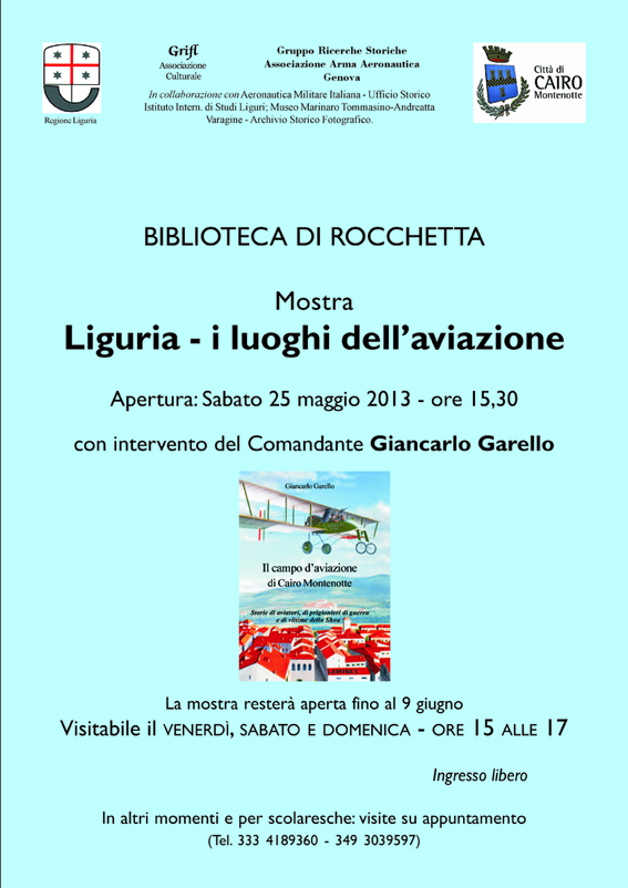 Organizzata dal Gruppo Ricerche Storiche dell’Associazione Arma Aeronautica di Genova, con diverse qualificate collaborazioni, dopo una prima esposizione nel Palazzo della Regione, si apre sabato 25 maggio alle ore 15,30 a Rocchetta, nei locali della Biblioteca comunale, la mostra dedicata a “I luoghi dell’aviazione in Liguria”. L’esposizione comprende una ventina di grandi pannelli fotografici con notizie storiche e tecniche sugli aeroporti e i luoghi di produzione aeronautica della nostra regione. La mostra si propone di far conoscere al pubblico i luoghi della Liguria legati al mondo dell’aviazione. Le ricerche si sono indirizzate verso le località della nostra regione che, nel corso degli anni, sono state oggetto di studi, progetti, industrie o installazioni a carattere aeronautico. I cartelloni esposti trattano le seguenti località e strutture: - Genova: i voli dei pionieri e i primi aeroplani - Genova: le esigenze industriali e belliche della 1° G.M. : il campo volo Ansaldo a Trasta e la Sez. Idrovolanti Difesa Aerea della Regia Marina. - Genova: l’idroscalo - la pista sulle banchine del porto - l’aeroporto - i progetti dimenticati per l’aeroporto - le industrie aeronautiche Ansaldo - La Spezia: idroscali del Muggiano e di Cadimare - Sanremo e Porto Maurizio: le basi degli idrovolanti della Regia Marina nella prima Guerra Mondiale - Chiavari/Cogorno: la base dirigibili Regia Marina DIRI - 11 nella prima G.M. - Sarzana: l’aeroporto - Albenga: l’aeroporto di Villanova - Albenga Campochiesa: la base dirigibili Regia Marina DIRI - 9 nella prima Guerra Mondiale - Taggia: la base dirigibili Regia Marina DIRI - 10 nella prima Guerra Mondiale - Cairo Montenotte: Sezione Difesa Aerea Regio Esercito nella prima G. M. - Varazze: Cantieri Aeronautici Cives e la Sez. Idrovolanti Dif. Aerea della R. Marina nella prima G. M. - Rapallo: la base degli idrovolanti della Regia Marina nella prima G.M. - S. Margherita: linea aer. Aquila Airways 1954/56 - Genova, Finale Ligure, Villanova d’Albenga: le industrie aeronautiche Piaggio.
