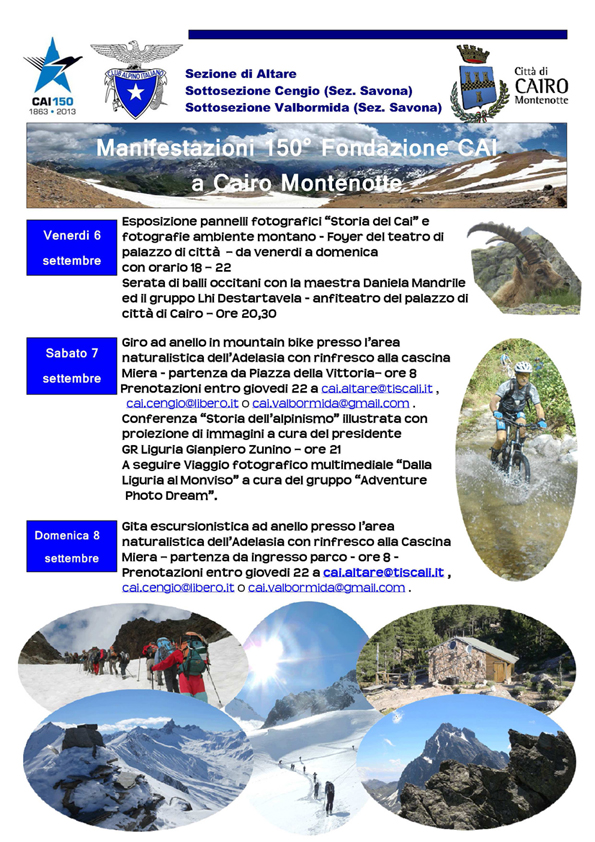 Quest’anno ricorre l’anniversario della nascita del CAI fondato nel 1863 da Quintino Sella; la celebrazione organizzata dalle varie sezioni CAI si sta svolgendo in tutta Italia. Per la prima volta nella loro storia, la sezione di Altare e le sottosezioni di Savona (Cengio e Cairo Montenotte) hanno unito le loro forze per organizzare una serie di manifestazioni aperte a tutti e completamente gratuite. Venerdi 6 settembre è prevista, presso l’anfiteatro del Palazzo di Città di Cairo, una serata di balli occitani con la maestra Daniela Mandrile ed il gruppo Lhi Destartarvela, sabato 7 un giro ad anello in mountain bike presso l’area naturalistica dell’Adelasia con partenza da Piazza della Vittoria di Cairo alle ore 8. In serata alle 21, nel teatro di Palazzo di Città di Cairo, la conferenza “storia dell’alpinismo” illustrata con proiezione di immagini a cura del presidente regionale CAI Giampiero Zunino. A seguire viaggio fotografico multimediale “Dalla Liguria al Monviso” a cura del gruppo Adventure Photo Dream. Domenica 8 gita escursionistica, sempre nel parco dell’Adelasia, con partenza alle ore 8 dall’ingresso al parco lungo la strada per Montenotte con rinfresco finale alla Cascina Miera offerto a tutti i partecipanti. Le prenotazioni molto gradite, sia per il giro in mountain bike che per la gita escursionistica, sono possibili tramite email agli indirizzi: cai.altare@tiscali.it - cai.cengio@libero.it - cai.valbormida@gmail.com