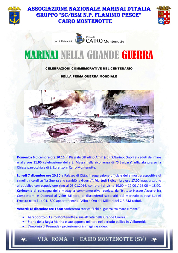Domenica 6 dicembre ore 10.15 in Piazzale cittadino Amm (sq). S.Garino, Onori ai caduti del mare e alle ore 11.00 celebrazione della S. Messa nella ricorrenza di “S.Barbara” ufficiata presso la Chiesa parrocchiale di S. Lorenzo in Cairo Montenotte. Lunedì 7 dicembre ore 20.30 a Palazzo di Città, inaugurazione ufficiale della mostra espositiva di cimeli e ricordi su “la Guerra che cambiò la Guerra”. Martedì 8 dicembre ore 17.00 inaugurazione al pubblico con esposizione sino al 06.01.2016, con orari di visita 10.00 – 12.00 / 16.00 – 18.00. Cerimonia di consegna della medaglia commemorativa, coniata dall’Istituto Nastro Azzurro fra Combattenti e Decorati al Valor Militare, ai discendenti superstiti del marinaio cairese Lupini Ernesto nato il 14.04.1890 appartenente all’Albo d’Oro dei Militari del C.R.E.M caduti. Venerdì 18 dicembre ore 17.00 conferenza storica “Echi di guerra tra mare e monti” • Aereoporto di Cairo Montenotte e sua attività nella Grande Guerra. • Storia della Regia Marina e suo apporto militare nel periodo bellico in Valbormida • L’impresa di Premuda - proiezione di immagini e video.