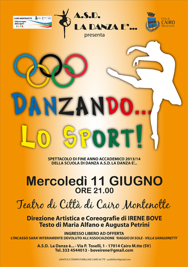La A.S.D. LA DANZA E’ presenta, venerdi’ 11 giugno alle ore 21 nel Teatro Città di Cairo Montenotte lo spettacolo “DANZANDO... LO SPORT!”, con direzione artistica e coreografie di Irene Bove e testo di Maria Alfano e Augusta Petrini, uno spettacolo dedicato allo sport per condividere i valori di lealtà, impegno e rispetto che troppo spesso vengono dimenticati, ricordando insieme il motto olimpico: CITIUS, ALTIUS, FORTIUS ovvero più veloce, più alto, più forte.