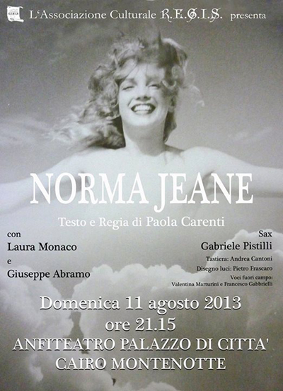 Domenica 11 agosto presso l'anfiteatro del Palazzo di Città, a partire dalle ore 21.15, è in programma lo spettacolo “Norma Jeane” scritto e diretto dall'artista cairese Paola Carenti, con Laura Monaco e Giuseppe Abramo e la partecipazione di Gabriele Pistilli al sax. E' il terzo appuntamento della Stagione Teatrale Estiva "Artisti sotto le stelle" realizzata dal Comune di Cairo – Assessorato alla Cultura e dalla Compagnia Uno Sguardo dal Palcoscenico grazie al contributo della Fondazione A. De Mari della Cassa di Risparmio di Savona. L’ingresso è gratuito.