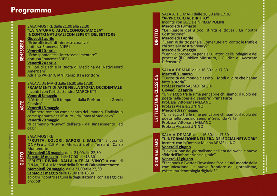 info: BIBLIOTECA COMUNALE 019/50707308-310 – biblioteca@comunecairo.it