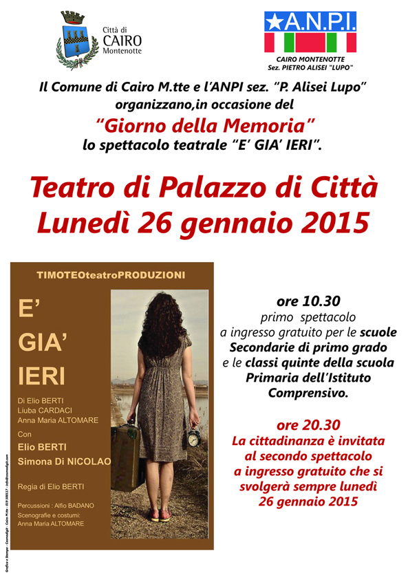 La Sezione cairese dell'ANPI, intitolata alla figura di Pietro Alisei "Lupo", ed il Comune di Cairo Montenotte organizzano, in occasione del Giorno della Memoria, lo spettacolo "E' già ieri" di Elio Berti, Liuba Cardaci e Anna Maria Altomare, a cura della compagnia Timoteoteatro.