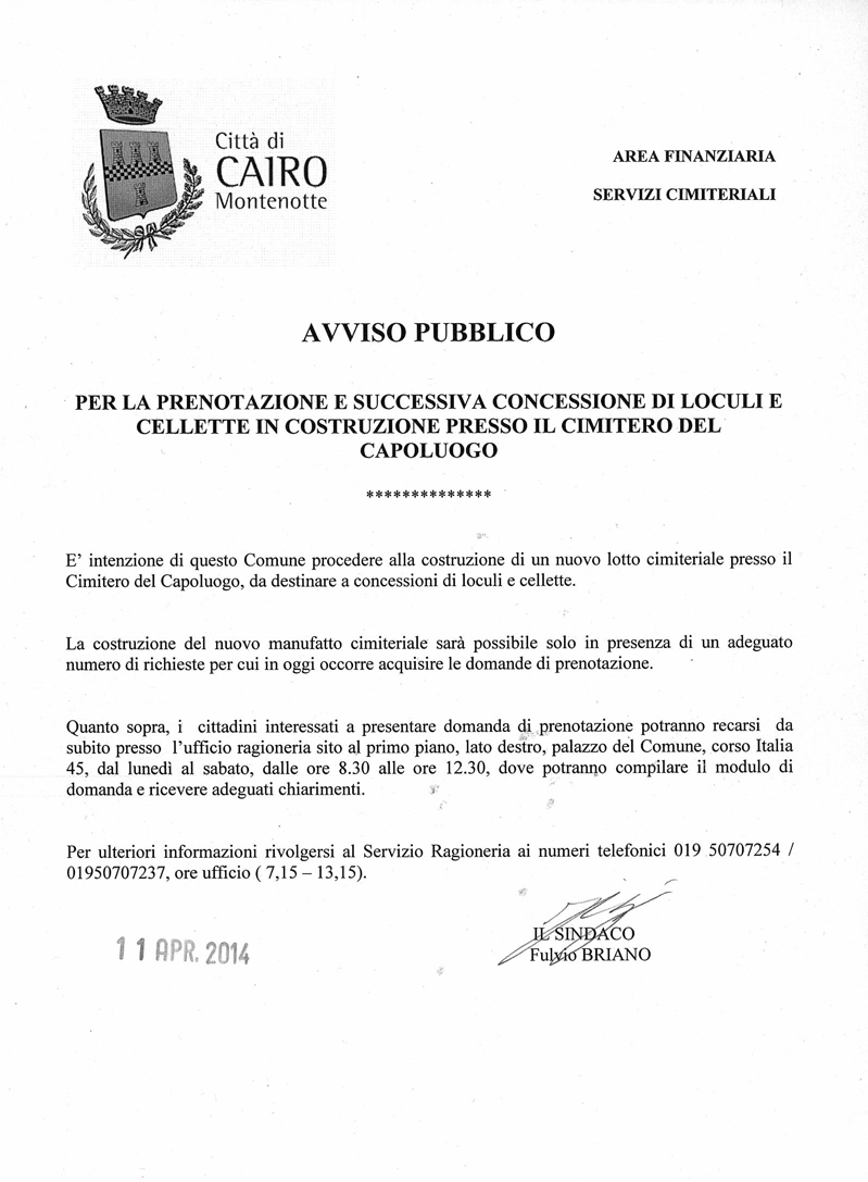 E' intenzione di questo Comune procedere alla costruzione di un nuovo lotto cimiteriale presso il Cimitero del Capoluogo, da destinare a concessioni di loculi e cellette. Il nuovo lotto verrà costruito solo in presenza di un adeguato numero di richieste per questo le persone interessate possono presentare domanda di prenotazione all'ufficio ragioneria.