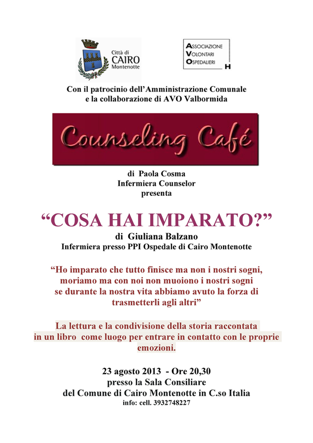 Venerdì sera alle 20,30 nella sala consiliare si terrà la presentazione del libro "Cosa hai imparato?" di Giuliana Balzano, infermiera presso l'ospedale San Giuseppe di Cairo Montenotte. Una narrazione introspettiva, autobiografica, dove l’autrice ripercorre il suo percorso di allieva infermiera al suo primo impatto con le sofferenze e la solitudine, vivendo esperienze fondamentali per la sua formazione professionale, per la costruzione delle relazioni con gli altri e per la sua crescita umana, etica e morale. L'iniziativa, patrocinata dal Comune, è proposta dal Couseling Cafè. La cittadinanza è invitata a partecipare.