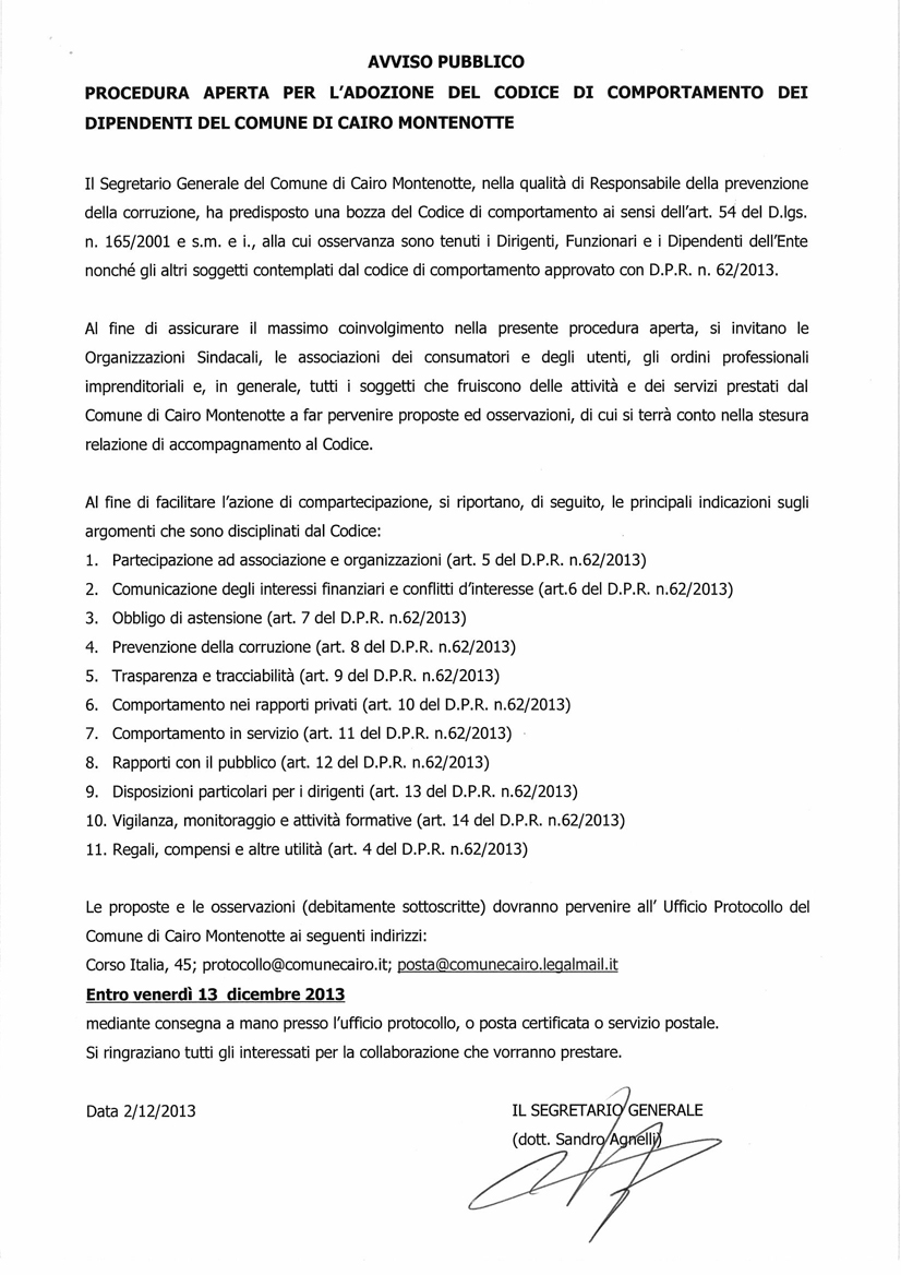 Procedura aperta per l'adozione del codice di comportamento dei dipendenti del Comune