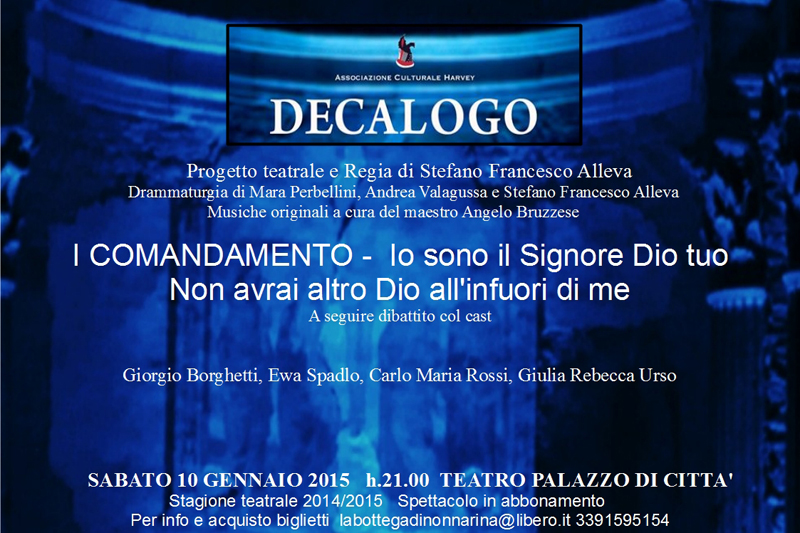 Comunicato Facendo tesoro delle esperienze raccolte nelle rappresentazioni del progetto in teatri e contesti diversi e in considerazione dell’intensità e complessità dei temi trattati nei singoli testi, la Compagnia dei “Decaloghers”, dopo attenta riflessione, è giunta a una consapevolezza: è preferibile proporre un singolo spettacolo, quindi Comandamento, per serata. Si è riscontrato che questa soluzione favorisce una maggiore e più adeguata “metabolizzazione” ed elaborazione delle tematiche proposte. Si è avuta occasione di sperimentare la “formula”, innovativa in ambito teatrale, della rappresentazione di un singolo testo per serata alla quale far seguire, per chi è interessato, un dibattito/confronto con la Compagnia sui temi proposti e affrontati. Questa formula si è dimostrata, oltre che inconsueta, convincente e coinvolgente e stimola la riflessione, il confronto e, talvolta, anche la conoscenza di esperienze di vita vissuta molto toccanti. E’ con questa stessa formula che la Compagnia dei “Decaloghers” propone il progetto per la Stagione Teatrale di Cairo Montenotte. Stefano Francesco Alleva