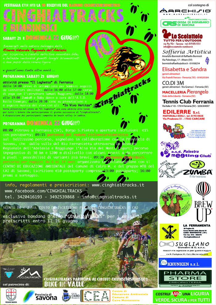 L'evento, che si terra' nella giornata del 22 giugno con ritrovo nella suggestiva cornice medioevale del Borgo dell'Abbazia di Ferrania (Iscrizioni dalle ore 8:00 e partenza ore 9:15), si svolgerà parallelamente su due percorsi: uno dedicato a cicloescursionisti esperti, si svilupperà su un tracciato impegnativo che permetterà di attraversare le zone paesaggisticamente più suggestive della Riserva, l'altro indicato a bambini e ragazzi dai 6 ai 14 anni, si svilupperà nel fondo Valle del Rio Ferranietta dove, in collaborazione con il Centro di Educazione Ambientale del Comune di Cairo Montenotte e con il gruppo BAMBI del CAI di Savona, verranno organizzate attività ludico/didattiche con uno spirito festoso ed allegro per avvicinare i ragazzi a questa meravigliosa attività che consente di vivere giornate indimenticabili all'aria aperta ed apprezzare la natura in tutte le sue forme ed espressioni.
