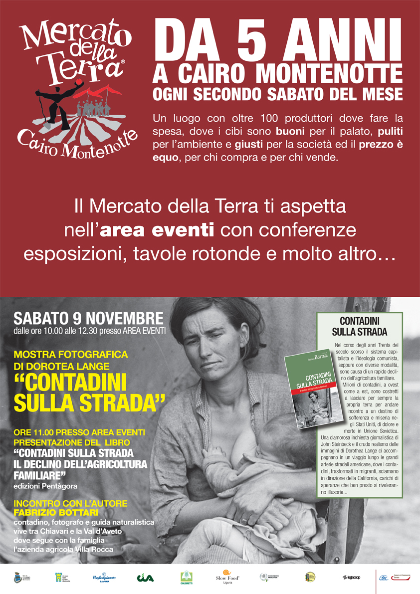 Sabato 9 novembre, come ogni secondo sabato del mese, Piazza della Vittoria si animerà grazie alla presenza del mercato della Terra, per questo appuntamento arricchito dalla presentazione del libro "Contadini sulla strada, il declino dell'agricoltura familiare" e dall'incontro con il suo autore Fabrizio Bottari, contadino, fotografo e guida naturalistica dell'entroterra ligure di levante.