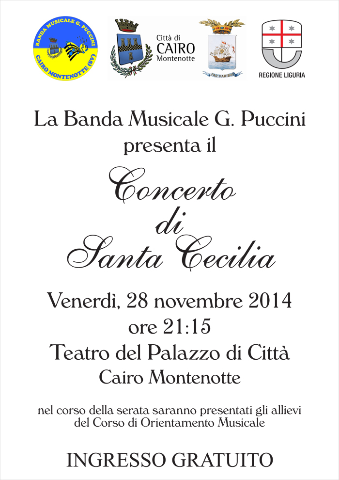 Venerdì 28 novembre alle ore 21.15 nel Teatro Città di Cairo Montenotte si svolgerà il tradizionale concerto della Banda musicale Giacomo Puccini in onore di Santa Cecilia, patrona della musica, dei musicisti e dei cantanti. La serata sarà anche l'occasione per la presentazione degli allievi del Corso di Orientamento Musicale.