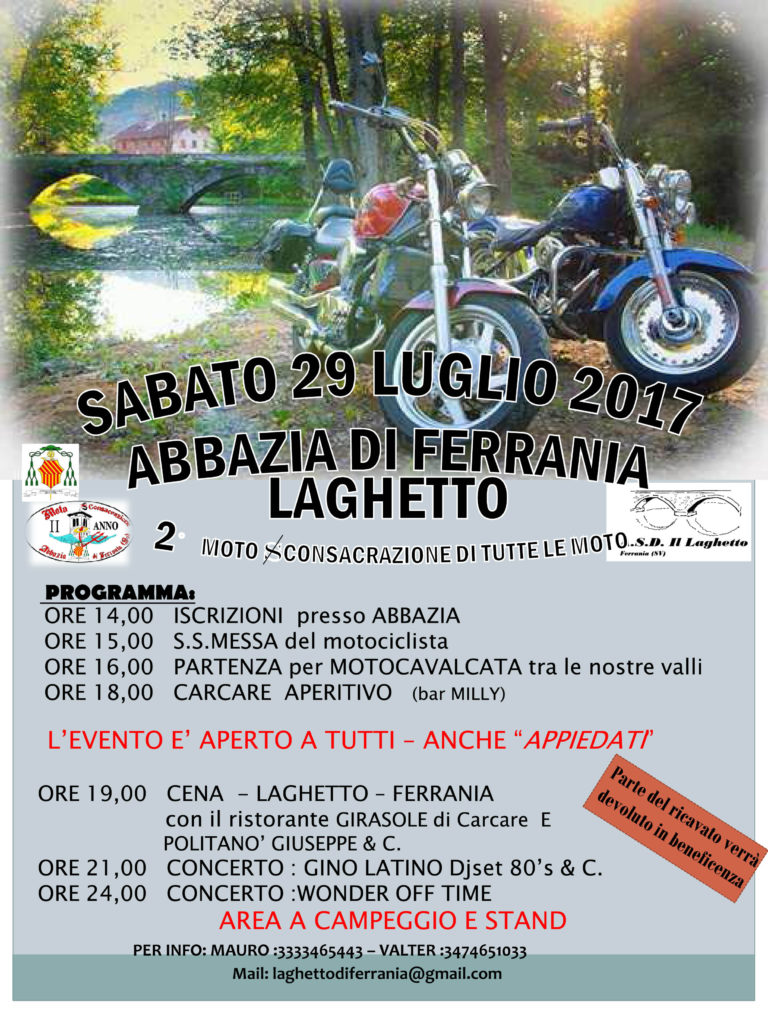 Sabato 29 luglio si svolgerà, a partire dalle ore 14,00, la seconda edizione della “Moto(S)Consacrazione di tutte le moto”, presso il Laghetto di Ferrania. Nel ricco programma, Santa Messa, "motocavalcata", cena conviviale e Djset 80's con Gino Latino.