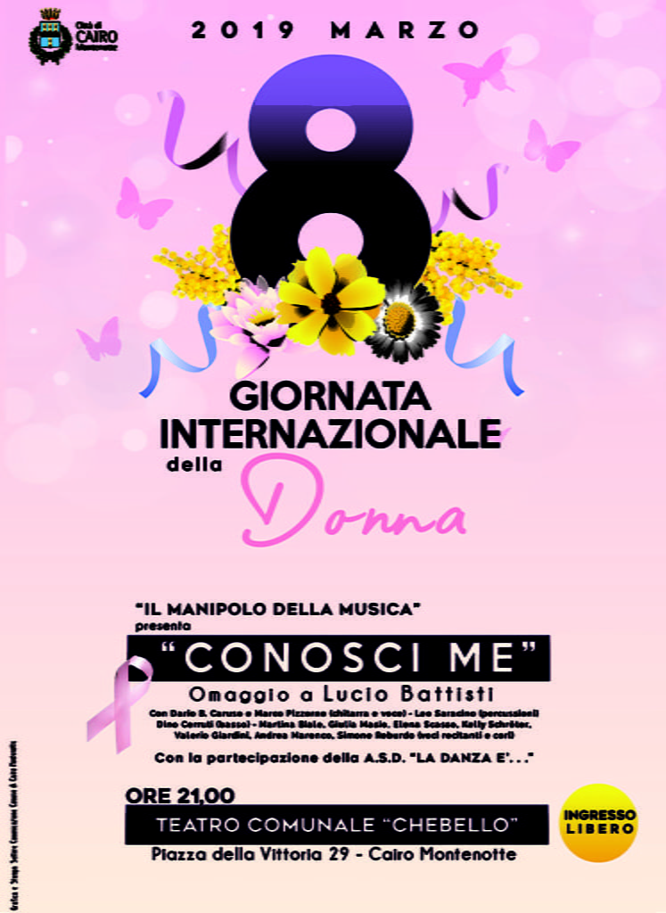 Per celebrare la Giornata Internazionale della Donna, venerdì 8 marzo, l’Amministrazione Comunale propone alla cittadinanza lo spettacolo “Conosci me”, omaggio a Lucio Battisti de "Il manipolo della musica", con la partecipazione di "La Danza è...", alle ore 21 presso il Teatro Comunale “Chebello”. Ingresso libero.