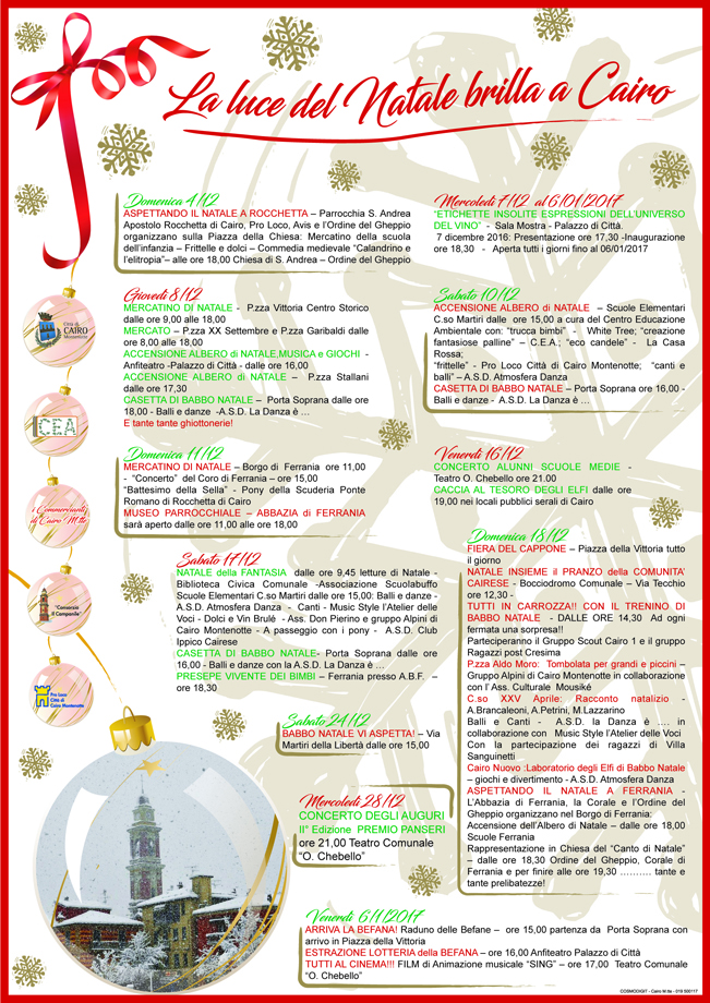 Sabato 17 dicembre, dalle ore 9,45 presso la Biblioteca Civica di Cairo, "ScuOlabuffo" propone "Natale della Fantasia", letture animate per i bambini. Presso le Scuole Elementari del Capoluogo, con inizio alle ore 15,00, pomeriggio di intrattenimento per grandi e piccini con i balli e le danze dell'A.S.D. "Atmosfera danza", i canti di "Music Style l'Atelier delle Voci", passeggiate con i pony curate dall'A.S.D. "Club Ippico Cairese" e dolci e Vin brulé distribuiti dal Circolo "Don Pierino" e dal Gruppo Alpini di Cairo. Presso la Casetta di Babbo Natale allestita a Porta Soprana, dalle ore 16,00, balli e danze con l'A.S.D. "La danza è. . .". A Ferrania, presso l'Attività Borgate Ferraniesi, dalle ore 18,30 si potrà vedere il Presepe Vivente dei Bimbi.