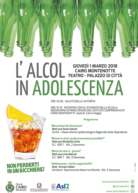 “L'alcol in adolescenza” è il tema del Convegno promosso dall’Amministrazione comunale con l’Istituto Comprensivo e l’Asl 2 Savonese, che si svolgerà giovedì 1 marzo, con inizio alle ore 10,00 presso il Teatro Comunale “Chebello”.