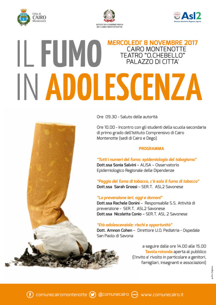 “Il fumo in adolescenza” è il tema del Convegno promosso dall’Amministrazione comunale con l’Istituto Comprensivo e l’Asl 2 Savonese, che si svolgerà mercoledì 8 novembre, con inizio alle ore 9,30 presso il Teatro Comunale “Chebello”.