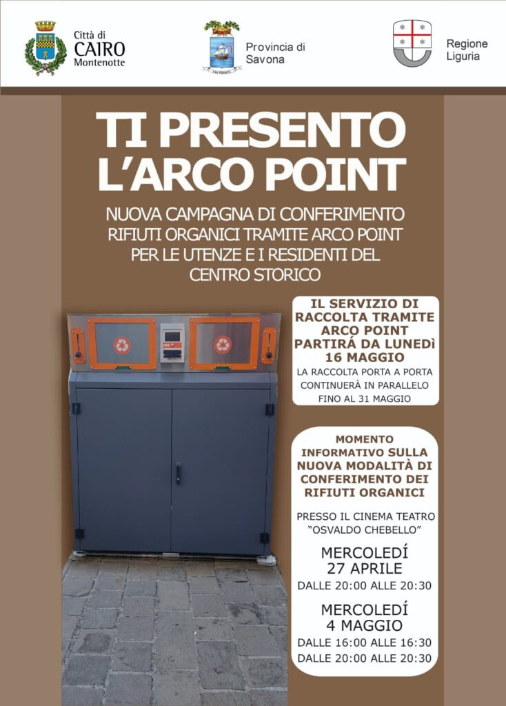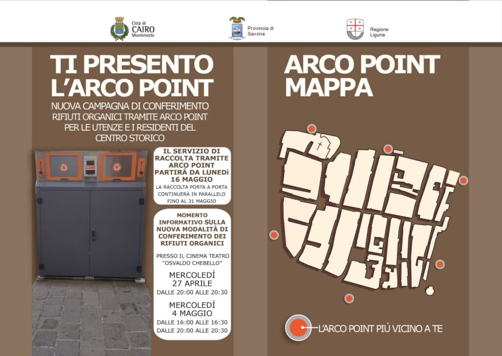 Il nuovo servizio di raccolta della frazione organica tramite "arcopoint" dedicato alle utenze del centro storico parte dal 16 maggio 2022 e sono stati previsti tre incontri informativi: mercoledì 27 aprile alle ore 20 e mercoledì 4 maggio doppio appuntamento alle 16 e alle 20 presso il teatro comunale "Chebello".[/fusion_text][fusion_separator style_type="none" hide_on_mobile="small-visibility,medium-visibility,large-visibility" sticky_display="normal,sticky" class="" id="" flex_grow="0" top_margin="15px" bottom_margin="15px" width="" alignment="center" border_size="" sep_color="" hue="" saturation="" lightness="" alpha="" icon="" icon_size="" icon_color="" icon_circle="" icon_circle_color="" /][/fusion_builder_column][/fusion_builder_row][/fusion_builder_container][fusion_builder_container hundred_percent="no" hundred_percent_height="no" hundred_percent_height_scroll="no" hundred_percent_height_center_content="yes" equal_height_columns="no" menu_anchor="" hide_on_mobile="small-visibility,medium-visibility,large-visibility" class="" id="" background_color="" background_image="" background_position="center center" background_repeat="no-repeat" fade="no" background_parallax="none" enable_mobile="no" parallax_speed="0.3" video_mp4="" video_webm="" video_ogv="" video_url="" video_aspect_ratio="16:9" video_loop="yes" video_mute="yes" video_preview_image="" border_color="" border_style="solid" margin_top="" margin_bottom="" padding_top="" padding_right="" padding_bottom="" padding_left="" admin_toggled="no" type="legacy"][fusion_builder_row][fusion_builder_column type="1_1" layout="1_1" spacing="" center_content="no" link="" target="_self" min_height="" hide_on_mobile="small-visibility,medium-visibility,large-visibility" class="" id="" background_color="" background_image="" background_position="left top" background_repeat="no-repeat" hover_type="none" border_color="" border_style="solid" border_position="all" padding_top="" padding_right="" padding_bottom="" padding_left="" margin_top="" margin_bottom="" animation_type="" animation_direction="left" animation_speed="0.3" animation_offset="" last="true" border_sizes_top="0" border_sizes_bottom="0" border_sizes_left="0" border_sizes_right="0" first="true"][fusion_separator style_type="shadow" hide_on_mobile="small-visibility,medium-visibility,large-visibility" class="" id="" sep_color="" top_margin="" bottom_margin="" border_size="" icon="" icon_circle="" icon_circle_color="" width="" alignment="center" /][/fusion_builder_column][/fusion_builder_row][/fusion_builder_container][fusion_builder_container type="flex" hundred_percent="no" equal_height_columns="no" menu_anchor="" hide_on_mobile="small-visibility,medium-visibility,large-visibility" class="" id="" background_color="" background_image="" background_position="center center" background_repeat="no-repeat" fade="no" background_parallax="none" parallax_speed="0.3" video_mp4="" video_webm="" video_ogv="" video_url="" video_aspect_ratio="16:9" video_loop="yes" video_mute="yes" overlay_color="" video_preview_image="" border_color="" border_style="solid" padding_top="" padding_bottom="" padding_left="" padding_right=""][fusion_builder_row][fusion_builder_column type="1_1" layout="1_1" background_position="left top" background_color="" border_color="" border_style="solid" border_position="all" spacing="yes" background_image="" background_repeat="no-repeat" padding_top="" padding_right="" padding_bottom="" padding_left="" margin_top="0px" margin_bottom="0px" class="" id="" animation_type="" animation_speed="0.3" animation_direction="left" hide_on_mobile="small-visibility,medium-visibility,large-visibility" center_content="no" last="true" min_height="" hover_type="none" link="" border_sizes_top="" border_sizes_bottom="" border_sizes_left="" border_sizes_right="" first="true"][fusion_text]