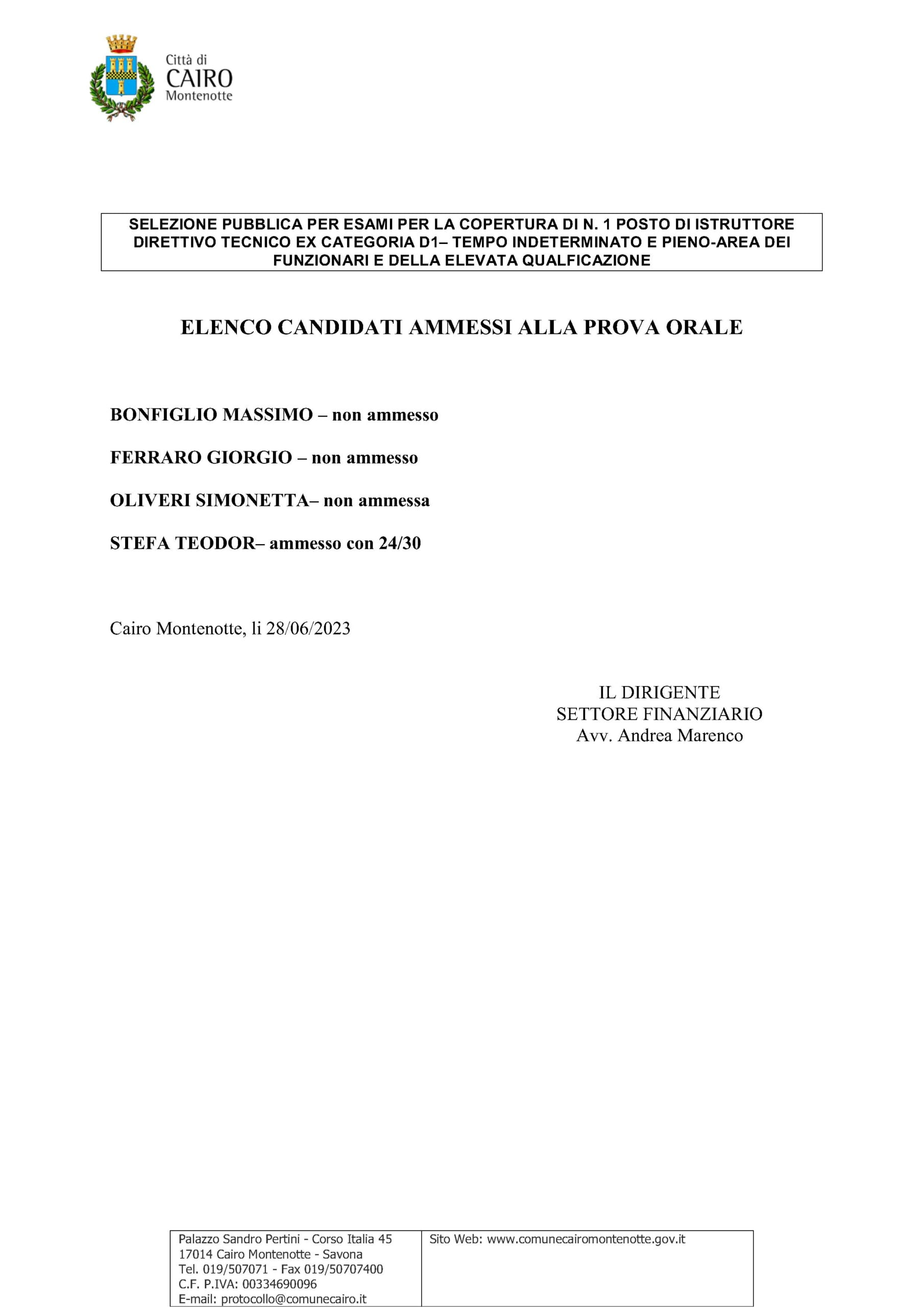 COMUNICAZIONE DATA E ORA PROVA SCRITTA E PROVA ORALE La prova SCRITTA si terrà mercoledì 28/06/2023 presso il Comune di Cairo Montenotte, Palazzo S. Pertini - Piazza della Vittoria, 29 ORE 9:30. La prova ORALE si terrà mercoledì 05/07/2023 presso il Comune di Cairo Montenotte, Palazzo S. Pertini - Piazza della Vittoria, 29 ORE 9:30. LEGGI/SCARICA L'AVVISO DI CONVOCAZIONE Avviso aggiornato il 08/06/2023 [fusion_builder_container hundred_percent="no" hundred_percent_height="no" hundred_percent_height_scroll="no" hundred_percent_height_center_content="yes" equal_height_columns="no" menu_anchor="" hide_on_mobile="small-visibility,medium-visibility,large-visibility" class="" id="" background_color="" background_image="" background_position="center center" background_repeat="no-repeat" fade="no" background_parallax="none" enable_mobile="no" parallax_speed="0.3" video_mp4="" video_webm="" video_ogv="" video_url="" video_aspect_ratio="16:9" video_loop="yes" video_mute="yes" video_preview_image="" border_size="" border_color="" border_style="solid" margin_top="" margin_bottom="" padding_top="" padding_right="" padding_bottom="" padding_left="" admin_toggled="no"][fusion_builder_row][fusion_builder_column type="1_1" layout="1_1" spacing="" center_content="no" link="" target="_self" min_height="" hide_on_mobile="small-visibility,medium-visibility,large-visibility" class="" id="" background_color="" background_image="" background_position="left top" background_repeat="no-repeat" hover_type="none" border_size="0" border_color="" border_style="solid" border_position="all" padding_top="" padding_right="" padding_bottom="" padding_left="" dimension_margin="" animation_type="" animation_direction="left" animation_speed="0.3" animation_offset="" last="no"][fusion_separator style_type="shadow" hide_on_mobile="small-visibility,medium-visibility,large-visibility" class="" id="" sep_color="" top_margin="" bottom_margin="" border_size="" icon="" icon_circle="" icon_circle_color="" width="" alignment="center" /][/fusion_builder_column][/fusion_builder_row][/fusion_builder_container]ELENCO CANDIDATI AMMESSI ALLA PROVA ORALE