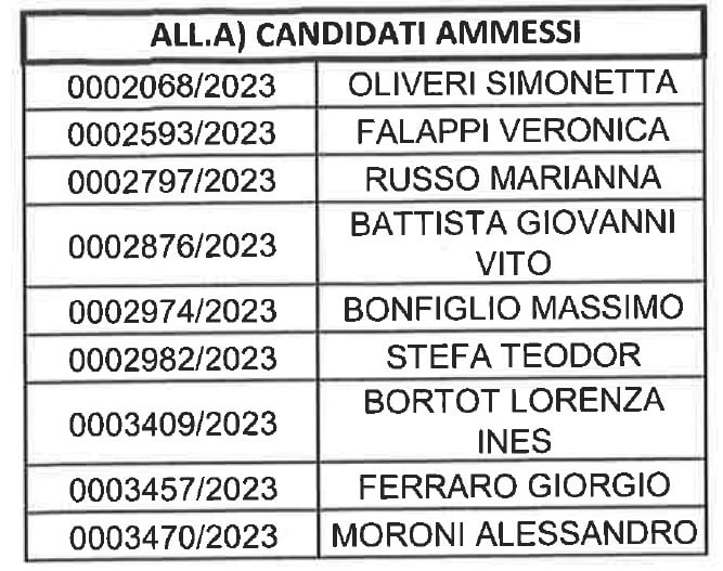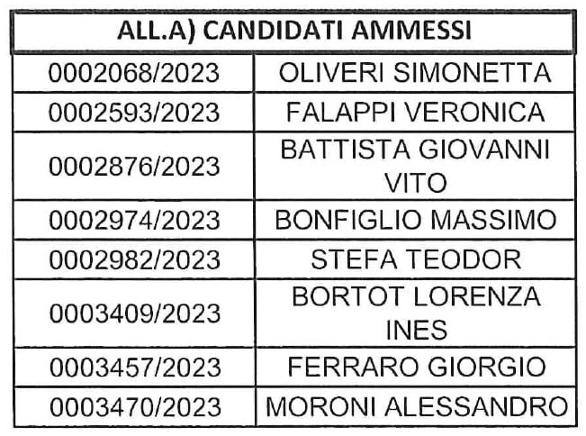 Con la determinazione nr 207del 07/03/2023 sono state dichiarate regolari e pertanto ammissibili le domande presentate dai seguenti candidati: