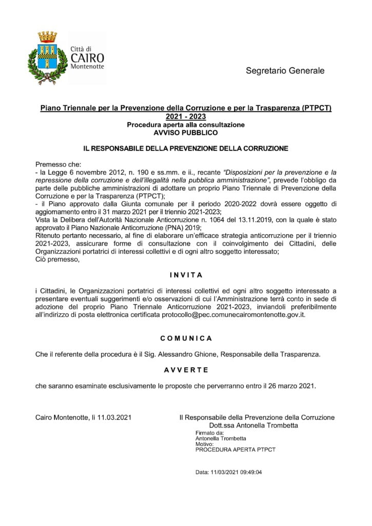Responsabile della Prevenzione della Corruzione è la dott.ssa Antonella Trombetta, Segretario del Comune di Cairo Montenotte, il responsabile della procedura è Alessandro Ghione, Responsabile della Trasparenza. I vigenti Piani sono pubblicati nella sezione “Amministrazione Trasparente” di questo sito. Per approfondire: vai al sito dell'Autorità Nazionale Anticorruzione - ANAC