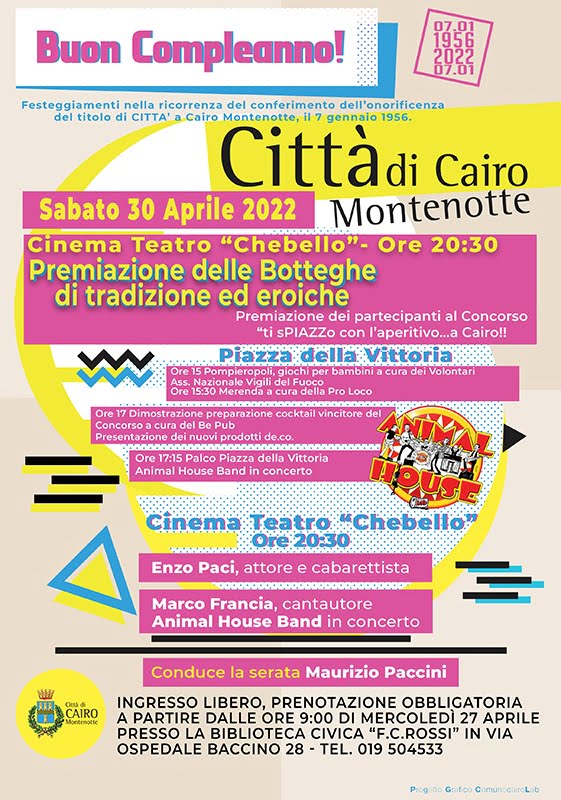 L'iniziativa "Buon Compleanno Città di Cairo Montenotte" sarà proposta sabato 30 aprile 2022, dapprima in Piazza della Vittoria con giochi per bambini, merenda a cura della Pro Loco, dimostrazione di preparazione cocktail e presentazione di nuovi prodotti De.Co., concerto della Animal House Band, successivamente nel Teatro comunale "Osvsaldo Chebello" con la premiazione delle Botteghe di Tradizione ed Eroiche, lo spettacolo del comico genovese Enzo Paci e l'esibizione dal vivo del cantautore Marco Francia insieme alla Animal House Band.