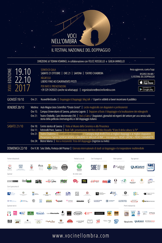 Ore 9.30 / Sala Sibilla, Fortezza del Priamar Audiovisivi e storie in comune. Doppiaggio, trasposizione multimediale, transfer linguistico e culturale da e per ogni dove, da e per ogni chi, alla soglia del 2000 Giornata internazionale di studi sul doppiaggiUna serata del Festiva Nazionale del Doppiaggio a Cairo