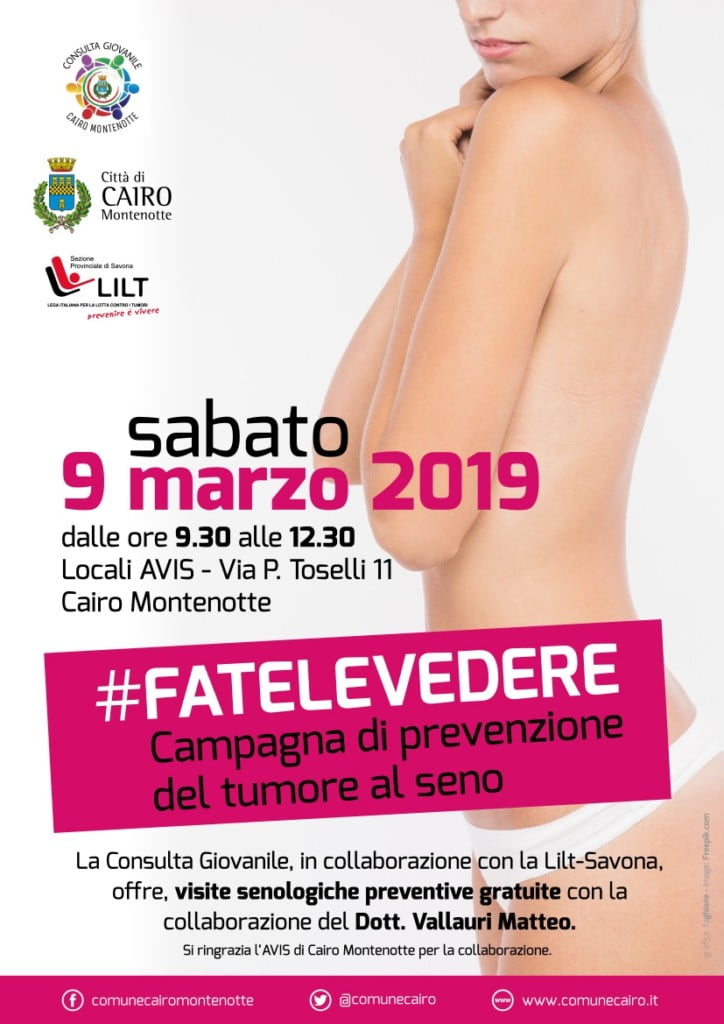 la Consulta Giovanile, in collaborazione con la Lilt - Sede di Savona, organizza visite senologiche preventive gratuite con la collaborazione del Dott.Vallauri Matteo, nell'ambito della campagna di prevenzione del tumore al seno #fatelevedere.