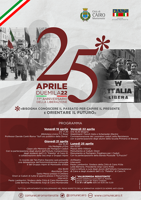 Dopo le ultime due edizioni, svoltesi all'insegna dell'emergenza Covid-19, per lo più a distanza con l'ausilio di video pre-registrati, quest'anno l'anniversario (numero 77) della Liberazione sarà nuovamente celebrato in presenza, con l'appuntamento principale in Piazza della Vittoria e altri eventi collegati presso i monumenti e nelle frazioni. Si comincerà giovedì 21 aprile con la cerimonia presso il cippo di Via Medaglie d'Oro, alla quale interverrà il Gruppo alpino di Monticello d'Alba, insieme agli studenti dell'Istituto Secondario Superiore "Federico Patetta". Si proseguirà nel tardo pomeriggio a Rocchetta Cairo con la messa al cimitero e l'onore ai caduti presso il monumento di Via Colletto. Il giorno successivo, venerdì 22 aprile alle ore 10:30, le celebrazioni si sposteranno a Bragno, con la commemorazione dei lavoratori deceduti durante la Resistenza, alla presenza degli alunni della Scuola Primaria della frazione. Infine, lunedì 25 aprile, a partire dalle ore 10:00, sarà il monumento ai caduti, nella rinnovata Piazza della Vittoria, ad ospitare la solenne celebrazione della Liberazione. Nel limitrofo Anfiteatro del Palazzo di Città, terranno il loro discorso commemorativo il Sindaco Paolo Lambertini e il Presidente dell'ANPI Leda Bertone, con i canti degli alunni dell'Istituto Patetta e l'esibizione della Banda Comunale "G.Puccini". Presso il foyer del Palazzo di Città dal 21 al 25 aprile sarà possibile visitare la mostra "Valbormida Resistente" a cura dell'Istituto Patetta.