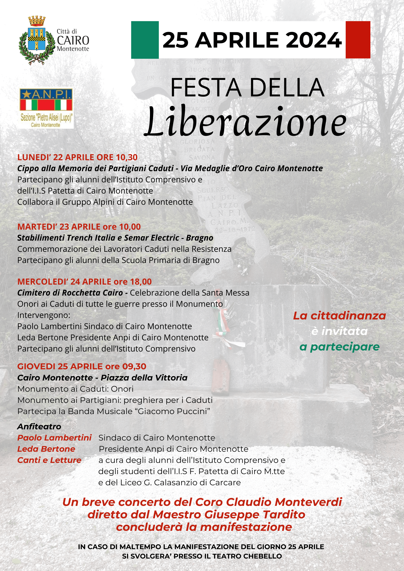 IN CASO DI MALTEMPO LA MANIFESTAZIONE DEL GIORNO 25 APRILE SI SVOLGERA’ PRESSO IL TEATRO CHEBELLO
